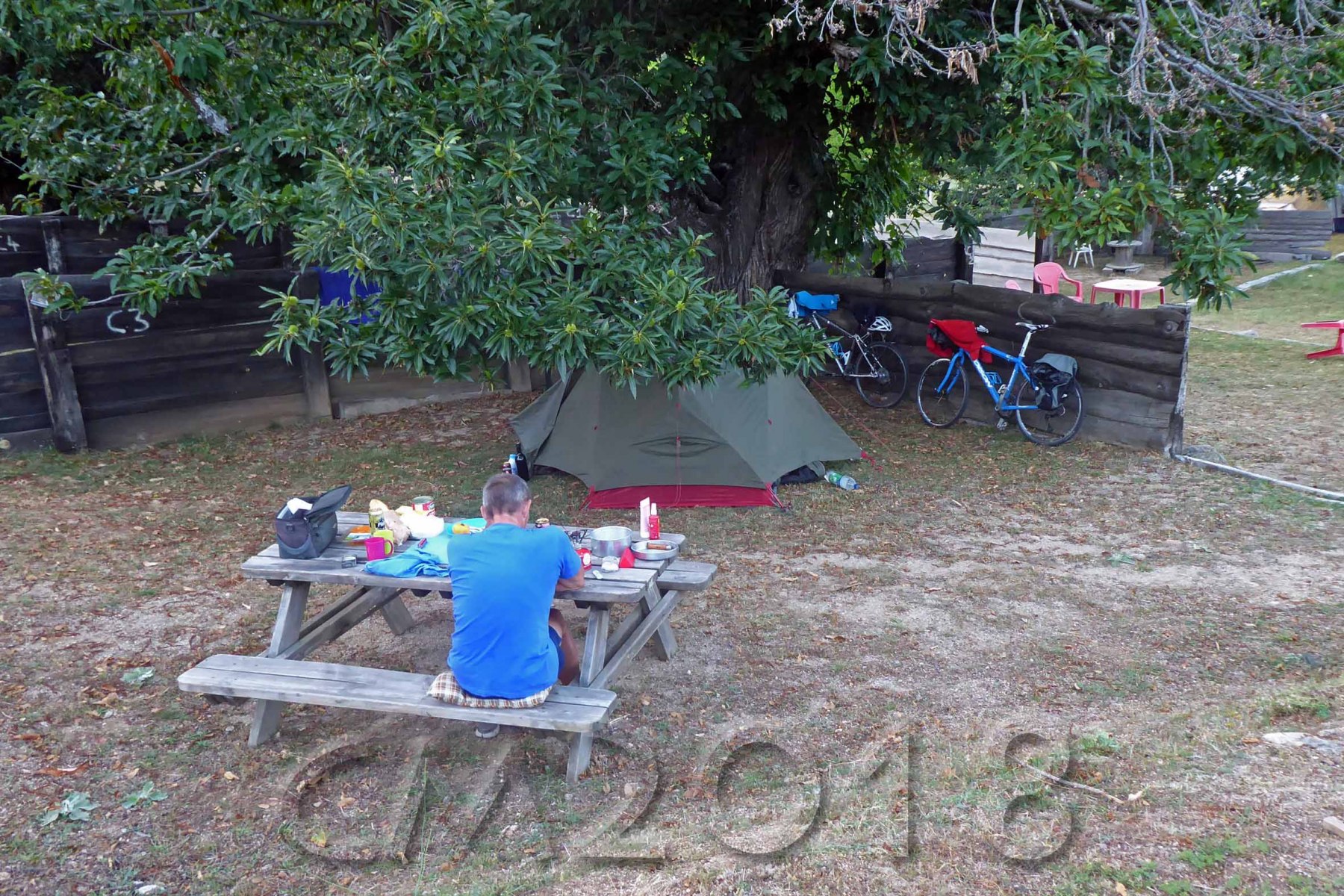 Zeltreisende haben freie Platzwahl auf dem Platz und finden unter Bäumen auch etwas Schatten. Zudem gibt es Tische und Bänke, und auch ein paar Stühle stehen zur freien Verfügung. Mehrere Stromanschlüsse sind auf dem Platz verteilt, so daß man sein Handy beim Laden immer im Blick haben kann. (Auf so vielen Campingplätzen gibt es Steckdosen nur in den Waschräumen.)